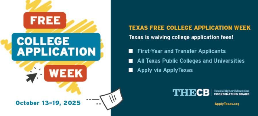 Exciting news for Texas students! Texas Free College Application Week is happening October 13-19, 2025. During this week, students can apply to any Texas public college or university for undergraduate admission without paying any application fees through ApplyTexas! This is a valuable opportunity to save money and support students’ paths to